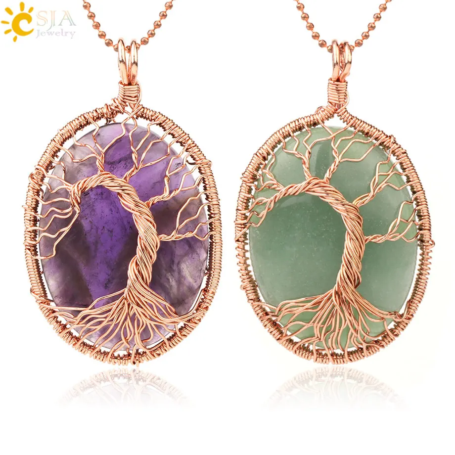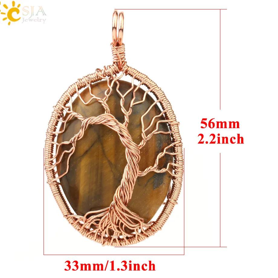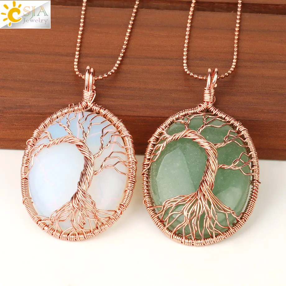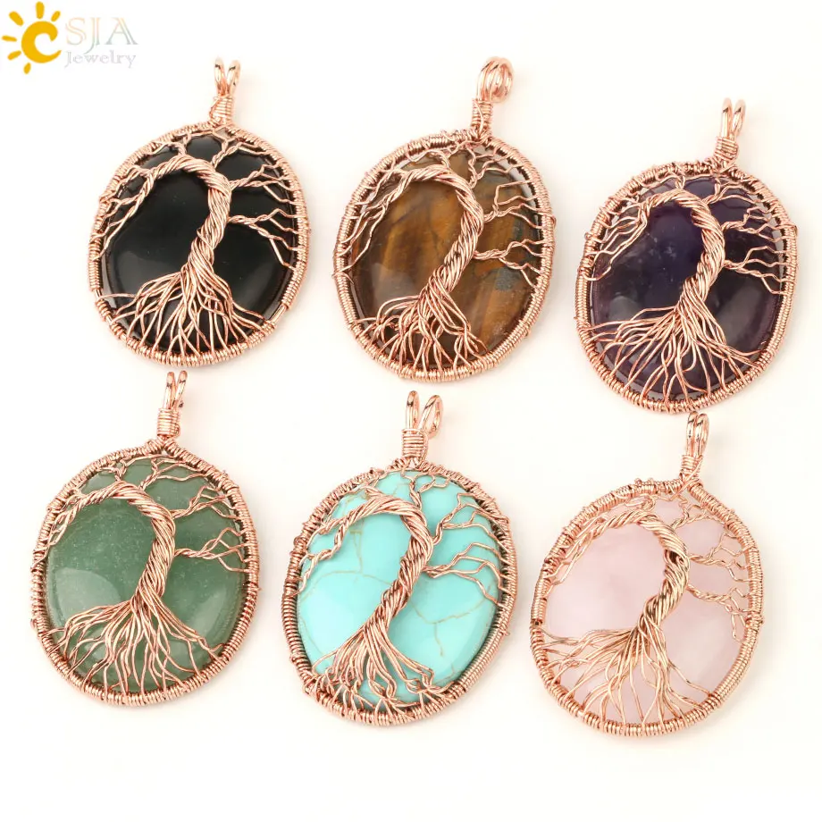 discounted CSJA New Arrival Natural Stone Pendant Wire Wrap Tree of Life Egg Shape Cabochon Crystal Handmade C